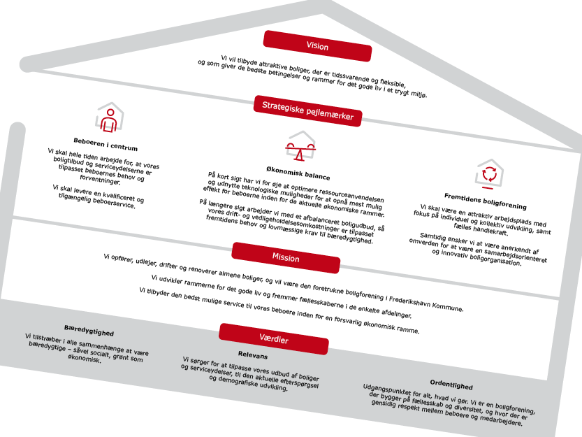 Jeg fik lov til at omsætte de mange gode input, notater og tanker til et strateginotat i et sprog og med en opbygning, som gør det muligt at omsætte ord til handling. Sammen med Nikolaj Busk udviklede vi også et enkelt formsprog med strategihus og ikoner, som nu hjælper boligforeningen i det videre arbejde med at folde strategien ud i praksis.